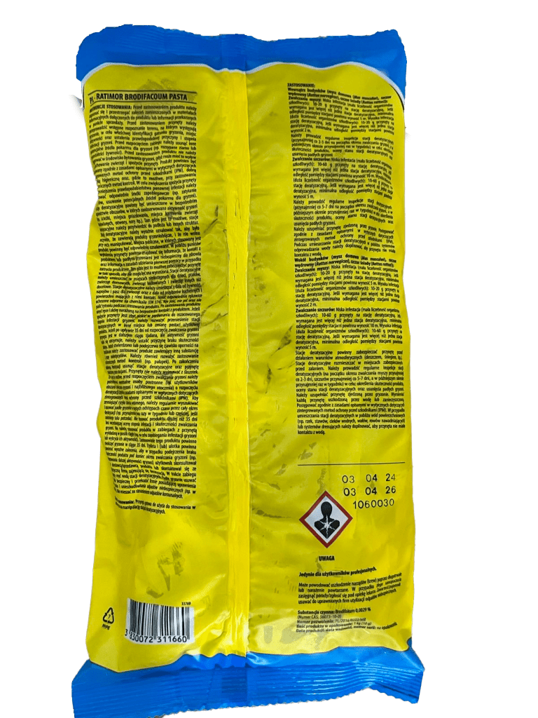 Ratimor Brodifacoum Pasta es un rodenticida anticoagulante de segunda generación en forma de pasta fresca en sachets, diseñado para eliminar ratas y ratones en interiores y exteriores. Contiene brodifacoum (0,0029%) y es altamente eficaz incluso en dosis únicas.